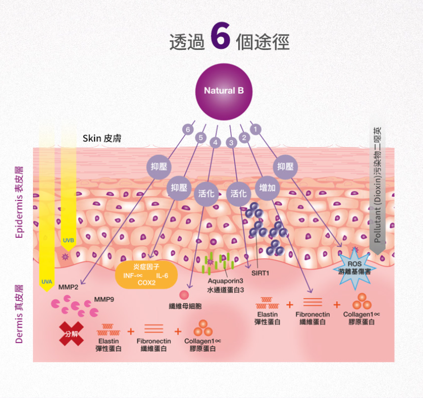 加強膠原增生外,阻截老化情況加劇同樣重要,Natural B 以四方面延緩細胞老化:抑壓游離基傷害、減慢膠原分解、減低細脆破損及抑壓導致細胞老化的炎症。